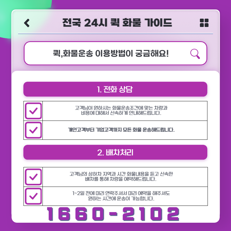 용달화물 서비스의 가장 큰 장점은 편리함과 신속성입니다. 대형 가구나 다수의 물품을 한 번에 운송할 수 있어 시간과 노력을 절약할 수 있습니다. 또한, 전문 기사님이 직접 물품을 수거하고 배송하기 때문에 안전하게 운송할 수 있습니다. 용달화물 서비스는 가정 이사, 사무실 이전, 대형 가구 운반 등 다양한 상황에서 활용할 수 있습니다.